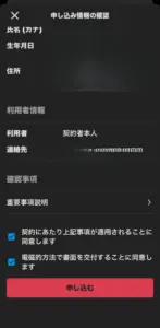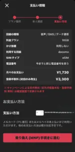 契約プラン、SIMタイプ、支払い料金、支払い方法の確認です。